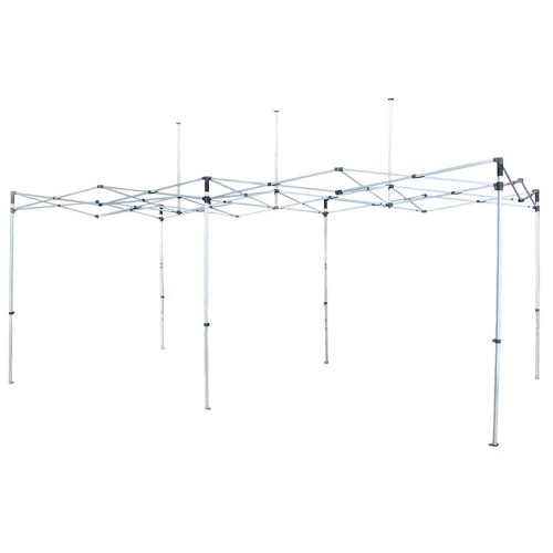 This canopy is a standard 20 ft. x 10 ft. size with five different heights ranging from 10.5 ft. to 11.25 ft. tall. Telescopic legs snap into place. Each hex leg is 1.8 mm thick.